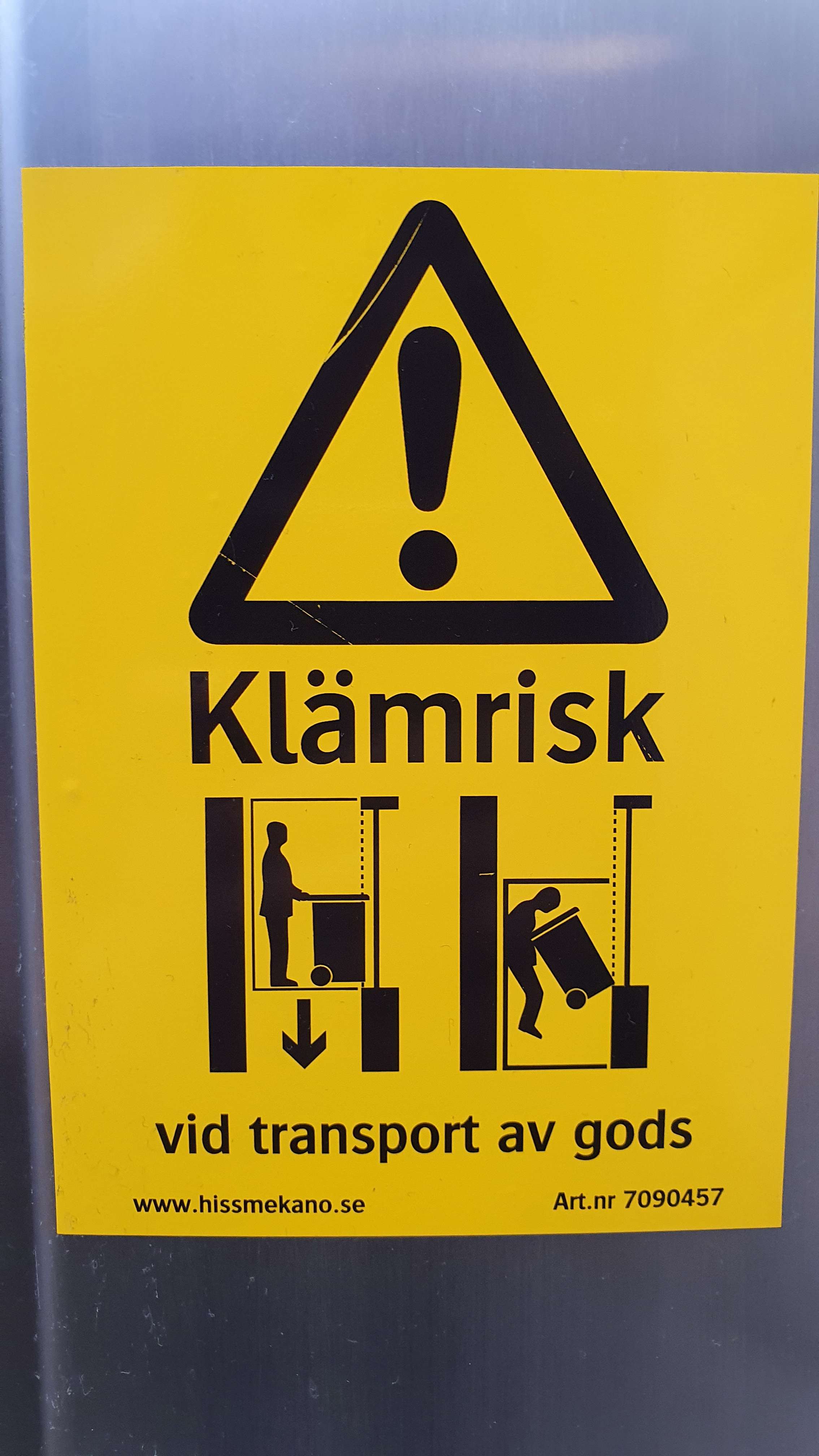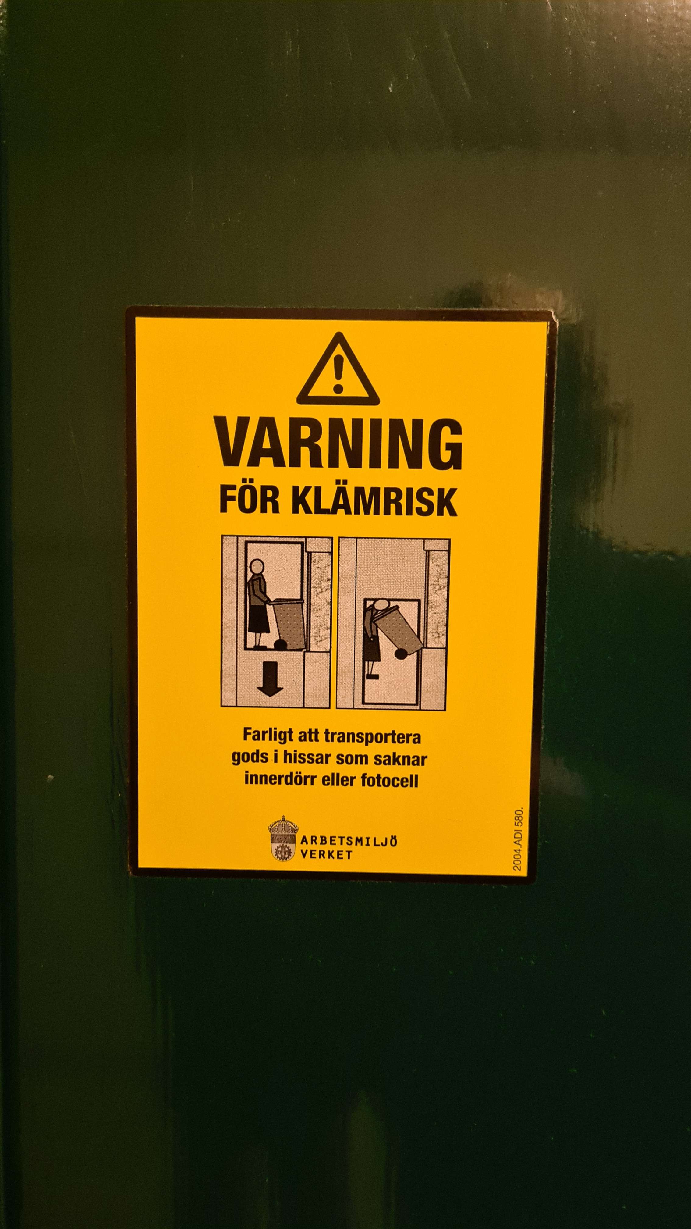 Klämrisk sign found by an elevator of an apartment building near Ruddammsparken in Stockholm. For some reason, no sign was present on the ground floor. An interesting thing to note about this sign is that the illustration features a woman instead of a man or unspecific human, which is somewhat unusual.